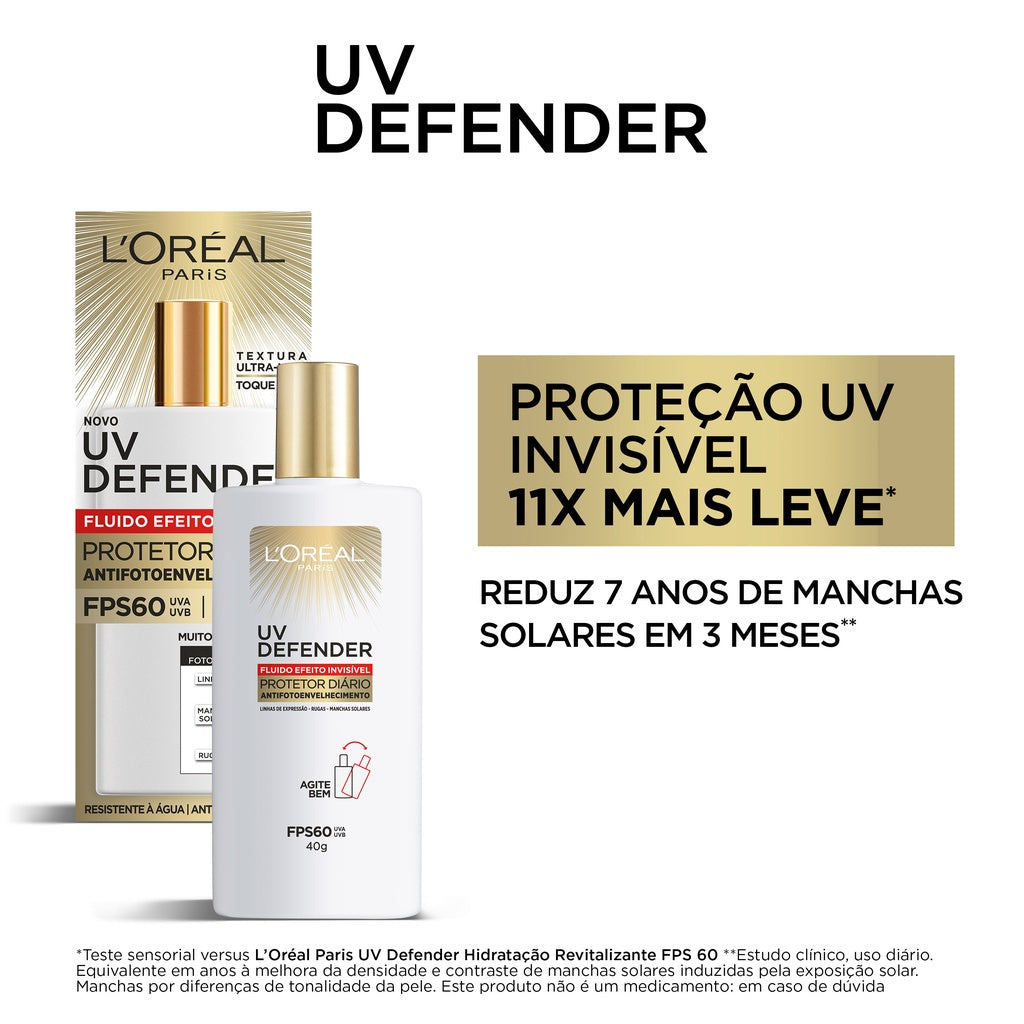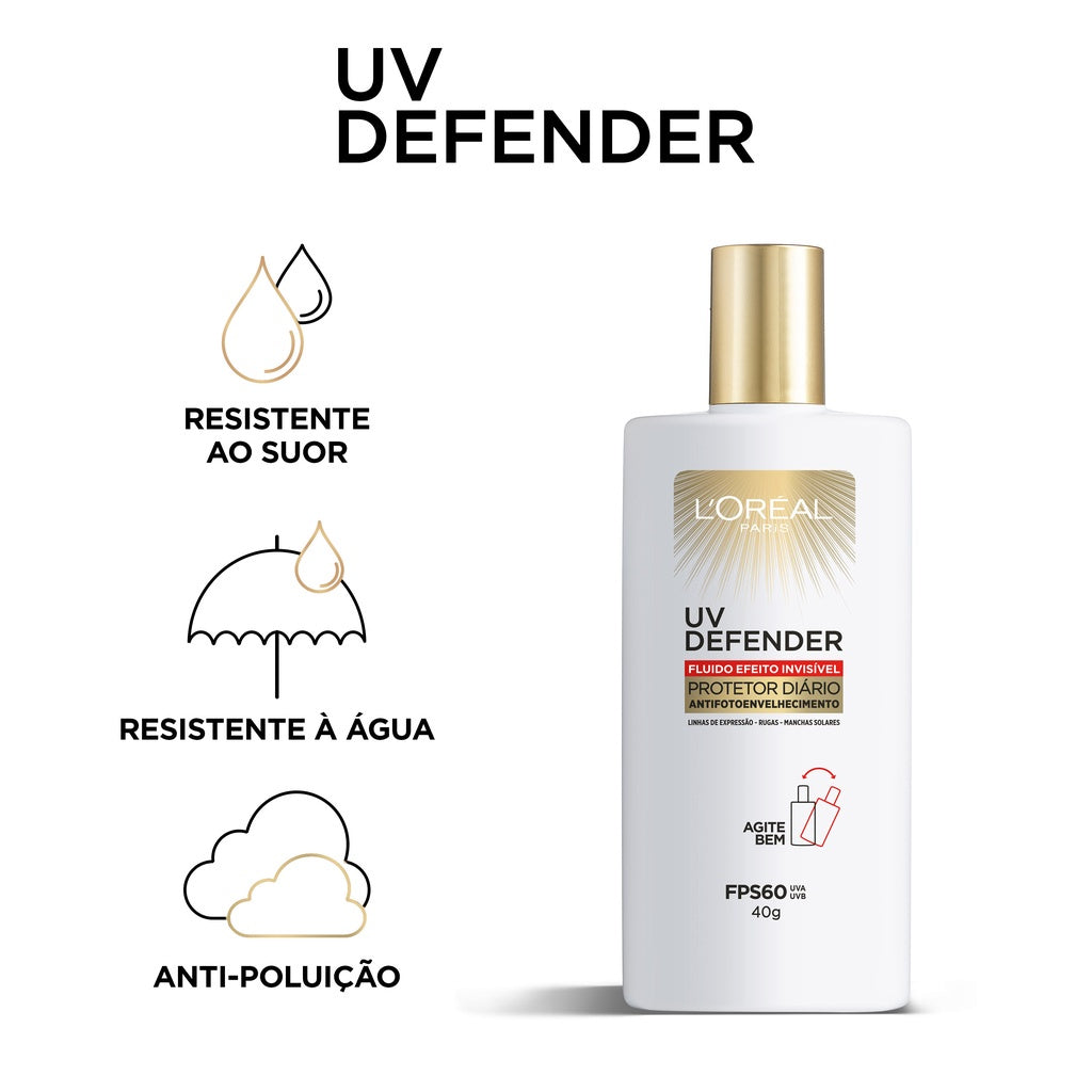 O UV Defender Fluido FPS 60 da L’Oréal Paris é um protetor solar facial de uso diário com ação antienvelhecimento comprovada. Sua fórmula combina o Ácido Hialurônico, que hidrata profundamente e suaviza linhas de expressão sem deixar a pele oleosa, com filtros solares avançados que oferecem alta proteção contra os raios UVA e UVB.